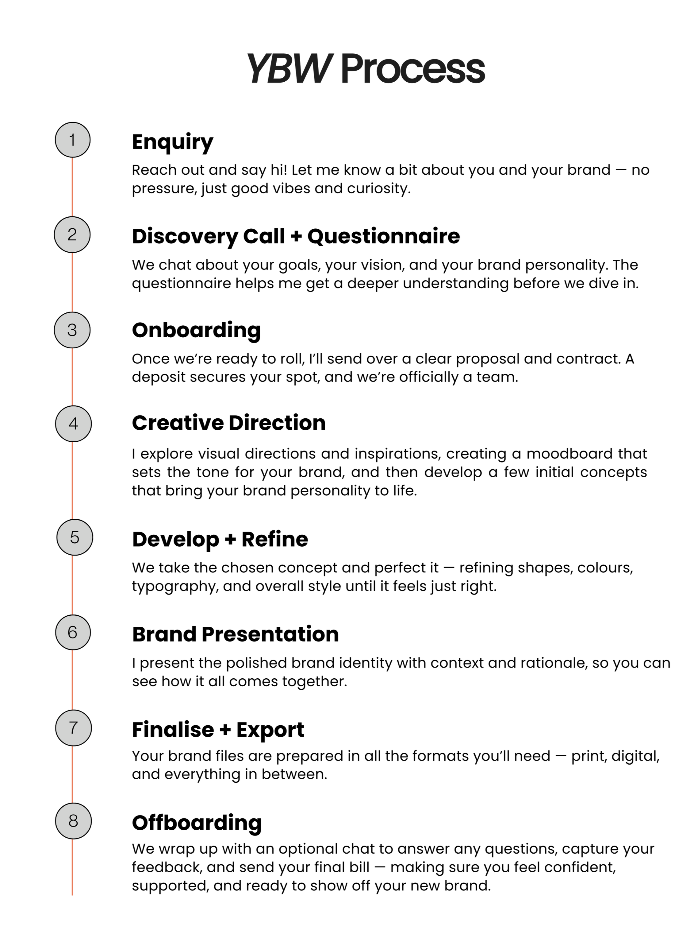 Branding shouldn’t feel overwhelming. Here’s how we work together to bring your story to life, with zero fuss and all the boldness.